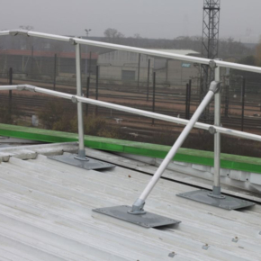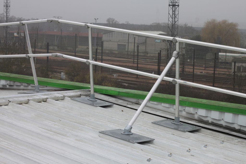 KEEGUARD Topfix provides a roof edge protection solution for metal profile and standing seam roofs up to 45 degree pitch. The specially designed base plate, which incorporates multiple fixing centres, allows installation to a wide range of popular roofs. Being an ‘off the shelf’ product, specification is simpler and it also removes the need to fabricate a different solution for each site, minimising site visits and down time. Base plates for standing seam roofs are fixed using non-penetrative 2-part clamps and metal profile roofs are fixed with minimal penetrations using rivets and butyl sealing strip to maintain the roof’s integrity. KEEGUARD Topfix allows for fast installation using preassembled uprights and open cup fittings and easily accommodates ridges, valleys, corners, changes in level and self closing gates etc. using standard KEE KLAMP fittings. The standard upright base fitting allows for 0-11 degree vertical adjustment and four fixing holes in the base plate allows it to be used in the most beneficial plane to suit the roof profile. The system is available in both galvanised steel and aluminium finish (aluminium system utilizes additional support brackets). Complies with the test requirements of BS EN 14122 part 3 and BS EN 13374 Class A, bay sizes for galvanised EN 14122 are 2.5m (1.75m end bays).