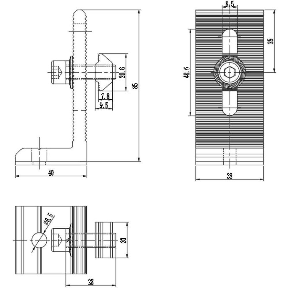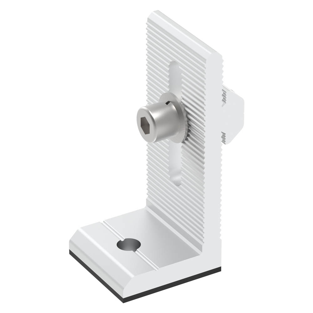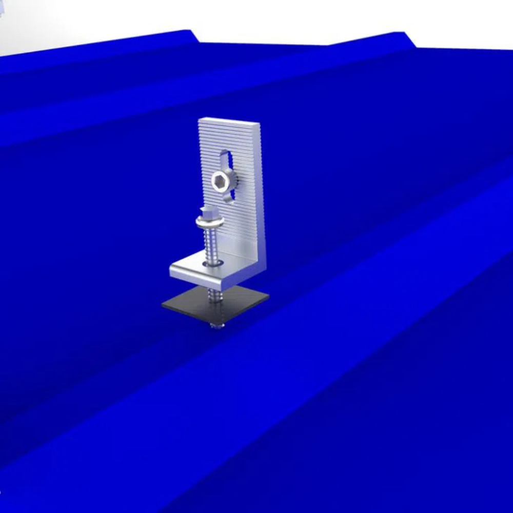 Clema tip L de sustinere, utilizată pentru a fi fixată pe suprafețele plate ale acoperișului sistemele orizontale de sustinere a panourilor. Suportul L este fixat direct cu un șurub bimetal direct pe tabla acoperiș și include la bază o plăcuță de cauciuc pentru separarea între diferite materiale.