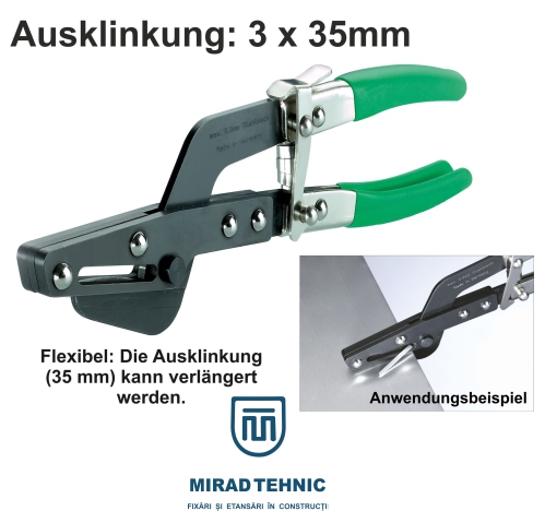 Foarfecele de crestături decupeaza o fanta de 3 x 35 mm din foaia de tabla, foarte utila atunci cand doriti sa faceti colturi ca de tava inaltate. Apropo, puteți continua tăierea la nesfârșit.