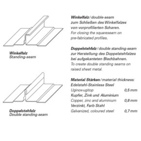 Dispozitivul Double Seam Closer închide rapid atât prima etapă (falt la 90 grade), cât și cea de-a doua etapă (falt dublu) pe panourile de acoperiș din oțel, aluminiu, cupru și zinc. Cu un singur cleste de închidere mecanică standard de 220mm.