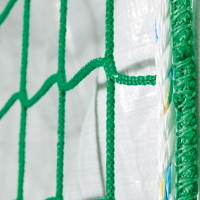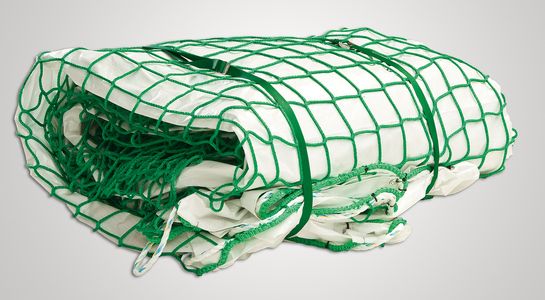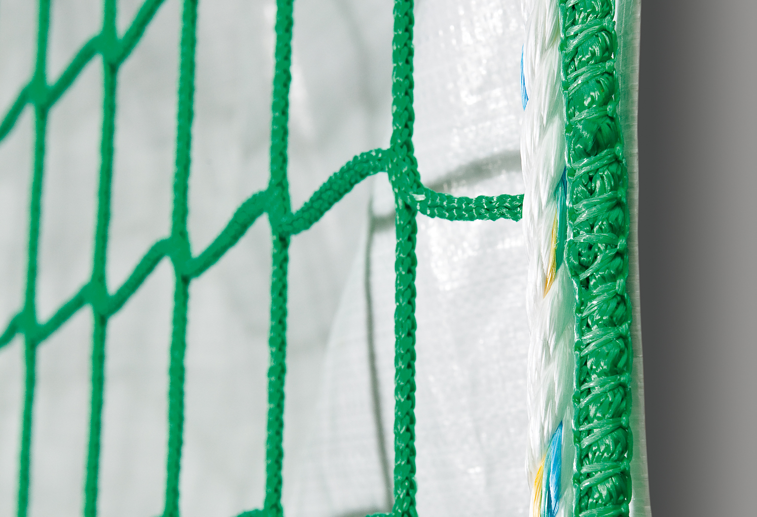 Plasa de siguranta fara noduri conform EN 1263-1 (bordate cu coarda), din propilena verde de inalta rezistenta de aprox. 5 mm, cu ochiuri de 100 mm, bordate cu coarda cu rezistenta de 30 kN. Are deja montata pe ea o prelata impermeabila transparenta (aprox. 150 g/m2), bordata cu coarda PP si ocheti din Al la fiecare 100 mm, prinsa de plasa de siguranta cu inele sau coliere la interval de aprox. 1 m.