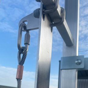 Dispozitiv LINIA VIETII VERTICAL cu cablu flexibil de protecție împotriva căderilor accidentale : dispozitiv mobil de protecție împotriva căderilor, ce integrează un amortizor de energie textil din poliester protejat de un tub termocontractabil și un carucior de glisare pe verticala cu blocare automată pe cablu din otel inoxidabil. Linie de ancorare rigidă ref STD0381 compusă dintr-un cablu din oțel inoxidabil ( 7×19 Ø8 mm) cu o terminație superioară de sertizare. În partea inferioară, un sistem de tensionare din oțel inoxidabil cu terminație sertizabila manual integrată. Capătul superior este terminat cu o lfixare rapidă ref: STD0380 din oțel inoxidabil pentru a permite conectarea la o placă superioară ref: STD0374. Capătul inferior este fixat direct pe placa inferioară ref: STD0794 sau STD0379